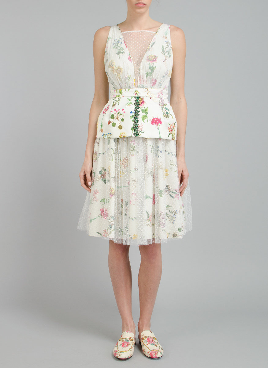 Баска Nº21 от сатен с флорален принт и бродерия; носи се на талията с прилежащата рокля Nº21.