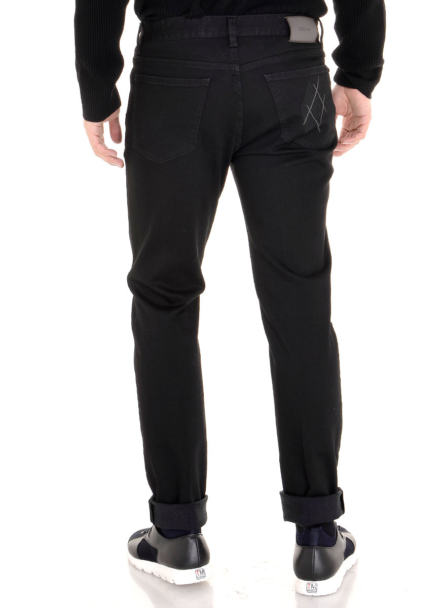 Дънки Z Zegna, комбинация от памук и еластан, модел с пет джоба, закопчаване с цип и копче, талията е обработена с колан и гайки.