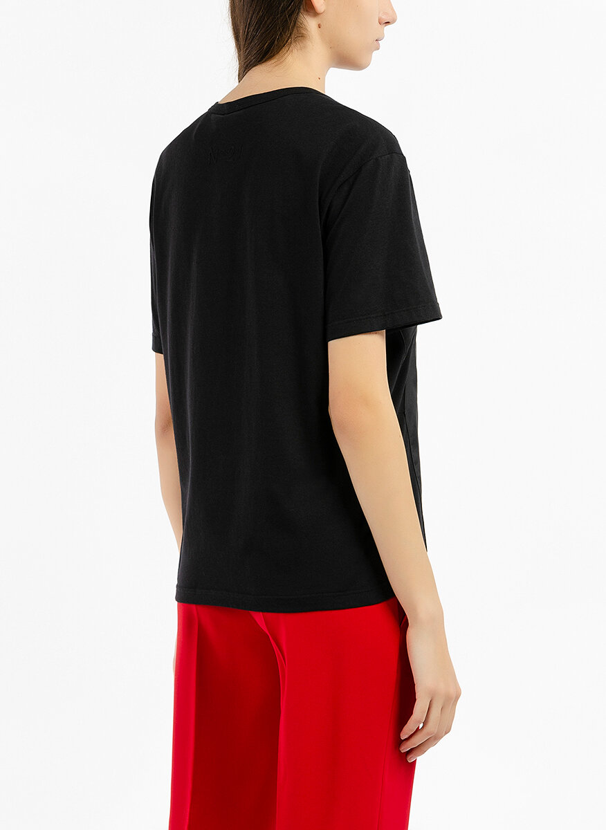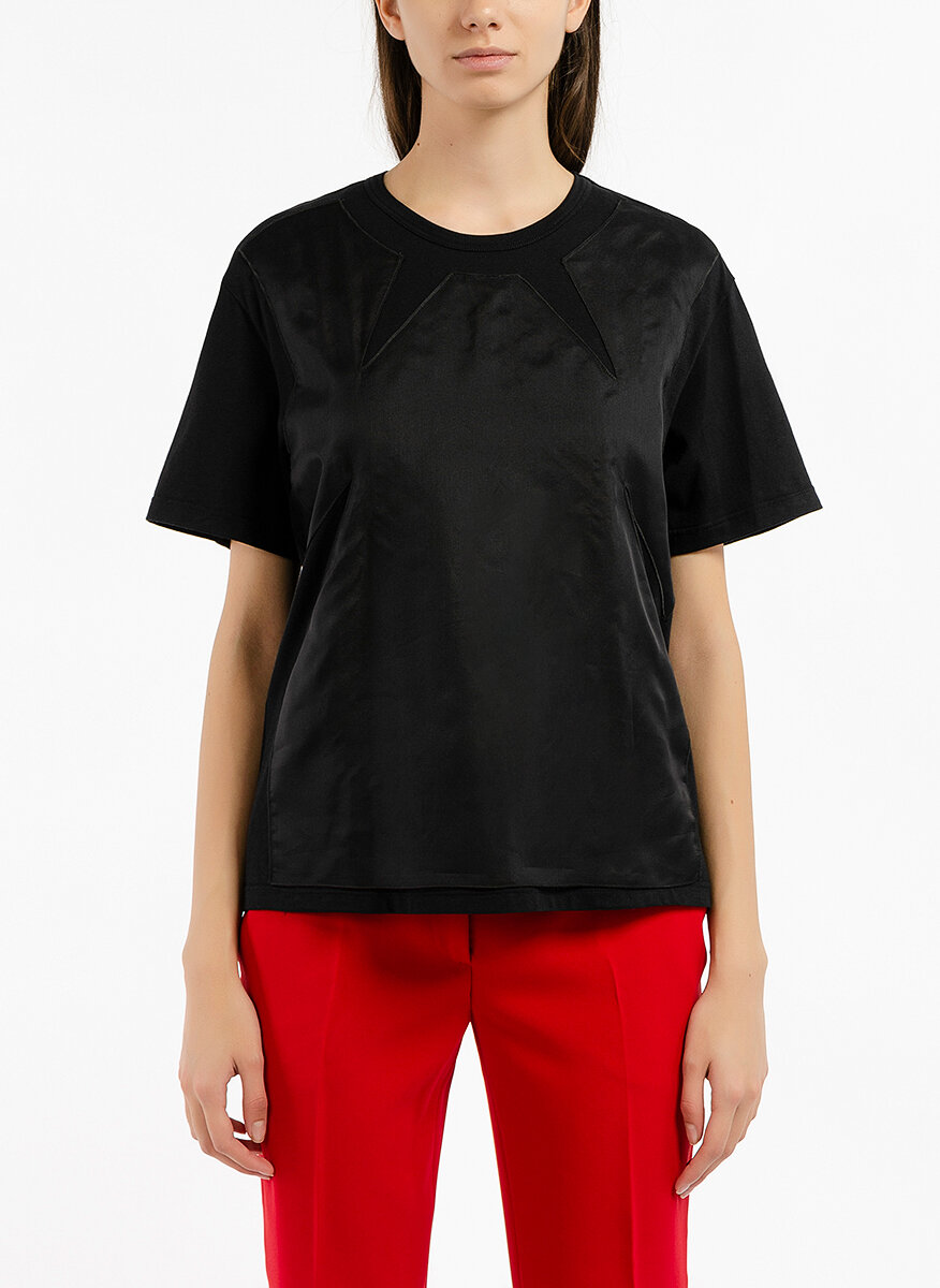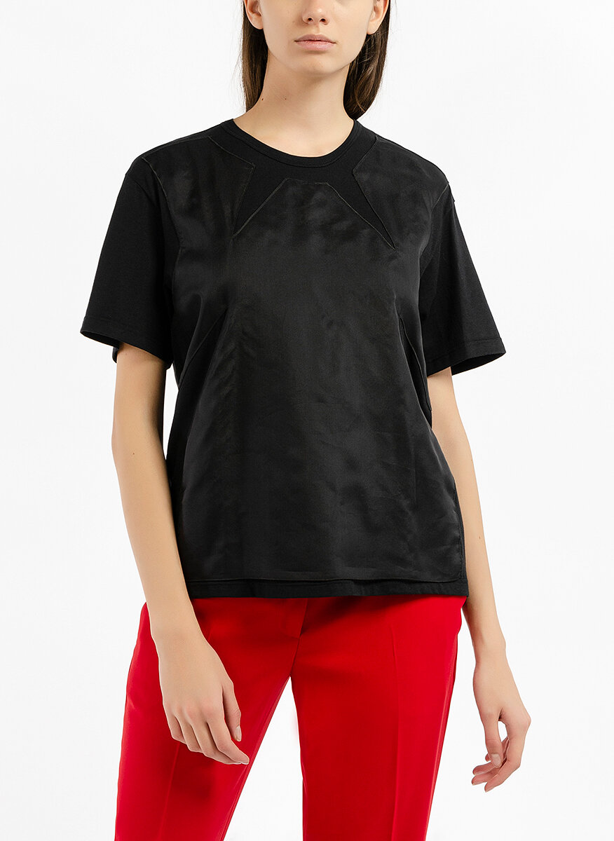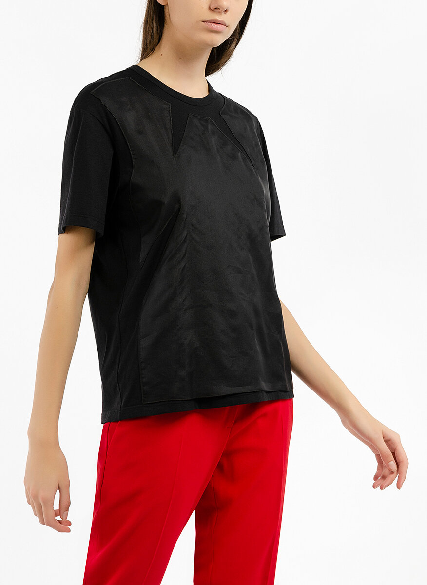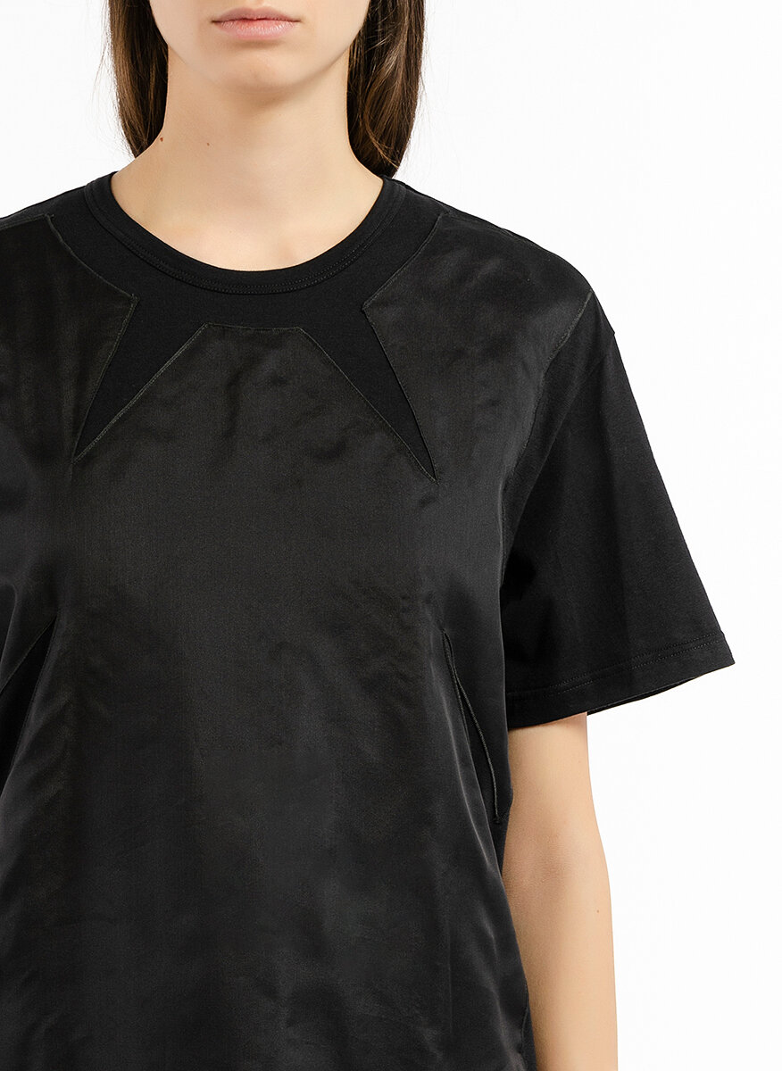Топ в две материи No.21, изработен от памук и панел от коприна, модел с обло деколте, леко втален силует, ръкав тип кимоно, геометрични неконтрастни детайли, дължина до хълбок.
