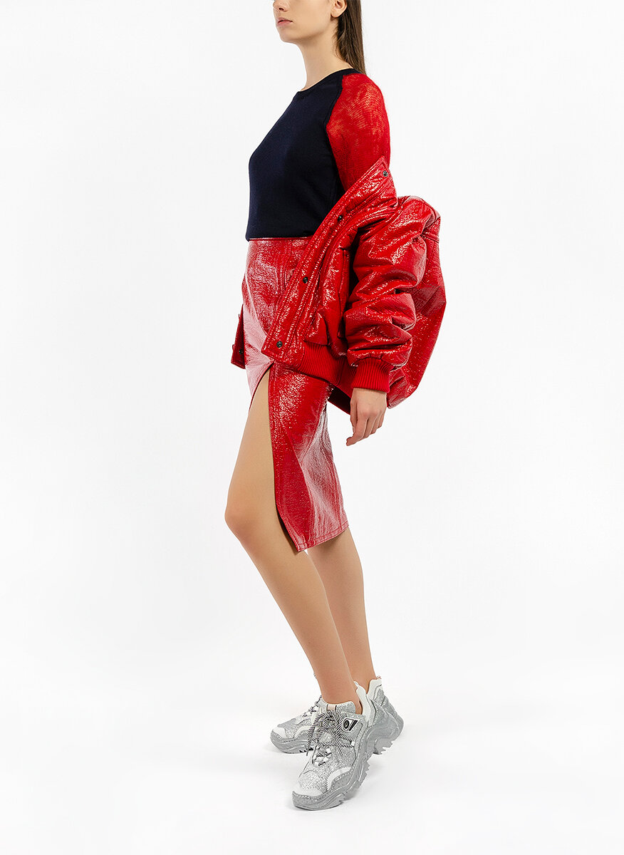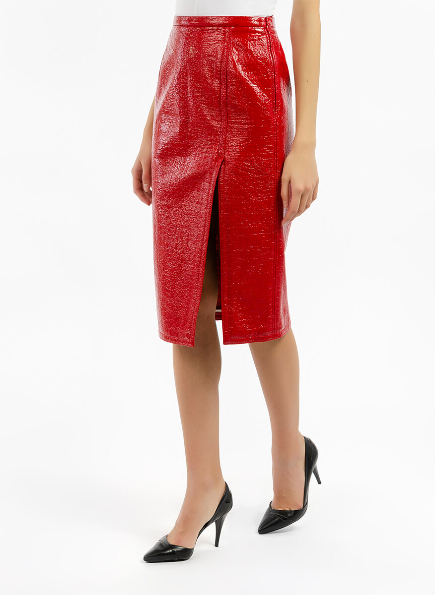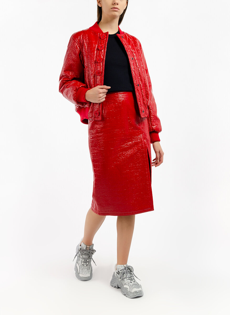Вталена пола с 'Crinkle' ефект No.21, изработена в комбинация от памук, вискоза и синтетична материя, модел с вталена кройка тип 'молив ', висока талия, закопчаване с цип в страни, изчистен десен с лачен ефект и набръчкване тип 'Crinkle', с разрез в предната част, миди дължина.